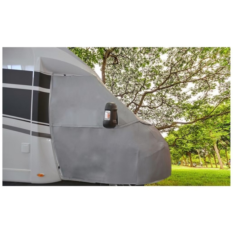 Copertura cofano motore. Spessore coibentante di 7 mm composta da: 2 in pvc + 7 mm resina espansa + 1 in pvc. Composto da una parte in velcro per collegarlo alla copertura vetro. Questo oscurante riflette il calore all'interno del mezzo nel periodo invernale, quando l'oscurante raggiunge il 100% di termicità. Nel periodo estivo, anche se l'alluminio non è a vista del sole, l'oscurante ottiene un ottima resa (80%). Si effettuano oscuranti su misura, per camper modelli speciali e motorhome.